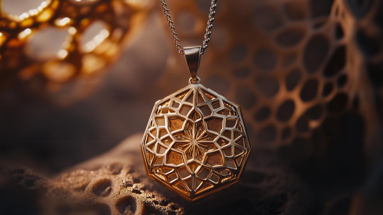 The choice of materials in geometric pendant creation is crucial to achieving both durability and beauty. Traditional Arabian gold, typically crafted in 21 or 22 carats, signifies prosperity and remains a cornerstone of fine jewellery making. The warm lustre of gold provides a perfect backdrop for intricate geometric designs, with hand-hammering, filigree work, granulation, engraving, and stone-setting techniques bringing each piece to life. Silver offers a cooler, more contemporary aesthetic that complements modern designs featuring mixed metals and customisation options, whilst steel provides strength and affordability without compromising on visual impact. Artisans employ time-honoured methods alongside cutting-edge technology integration to ensure that every pendant meets the highest standards of quality, creating investment-worthy pieces that can be treasured for generations.